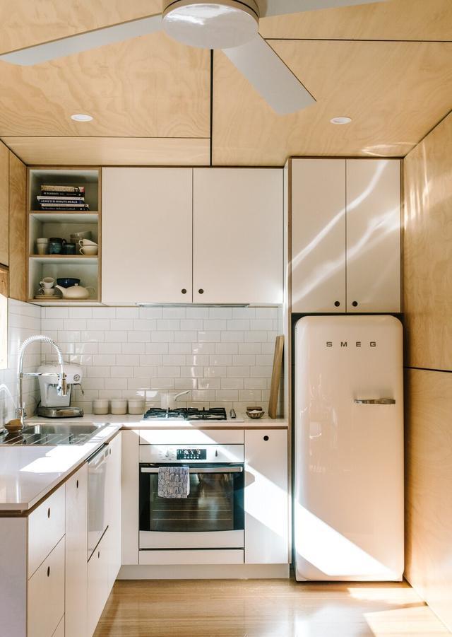低揮發性有機化合物、零甲醛的白色膠合板櫥柜、地鐵瓷磚的后擋板和石材臺面貫穿整個廚房。