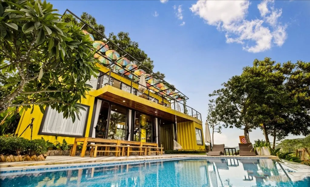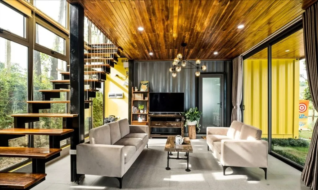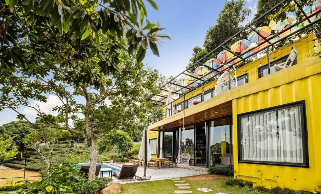 多個被漆成黃色的容器連接在一起形成了這個美麗的度假勝地。該項目采用現代化設計,并使用了兩種尺寸的容器構成,包括 20 英尺和 40 英尺。