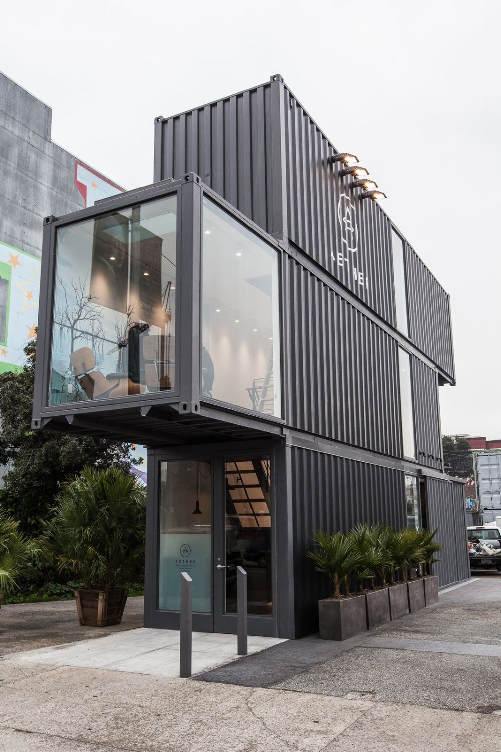 這是Aesther Apparel在舊金山推出的第一家獨立零售店。它由工作室Envelope A&D設計它由三個回收的集裝箱組成,這些集裝箱堆疊起來并略微懸臂,使商店具有動態的幾何外觀。交錯的容器保持工業外觀,但也具有相當主流的外觀,允許商店融入周圍環境,這主要是由于外墻和玻璃部分的深色著色。說到玻璃,第二個容器創造了一個看起來很酷的突起,一個玻璃懸臂,作為一個展示柜,同時帶來更多的陽光進入商店。在內部,這些容器具有再生橡木地板,使其具有非常溫馨的外觀,并為商店的工業設計增添了溫暖的感覺。第三個容器,頂部的容器,是一個存儲區域。