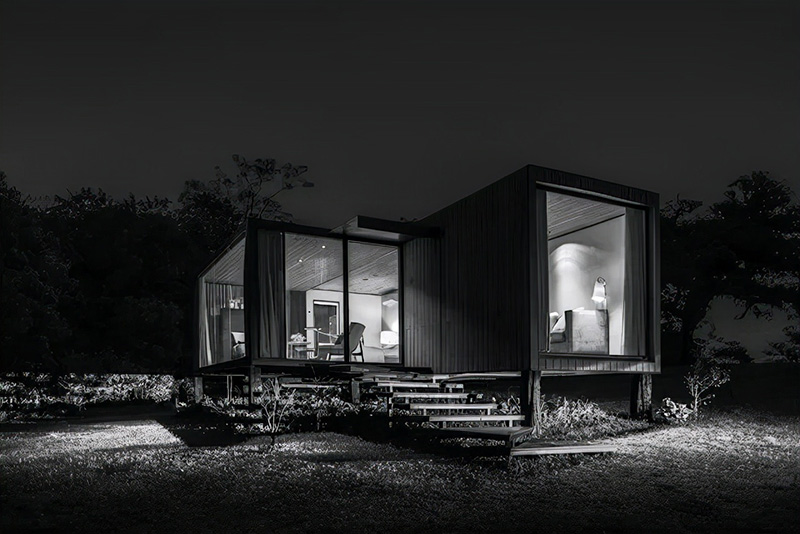 在這個以廣闊的綠地和石頭為標志的自然空間中,這座 50平方米的預制房屋考慮了一個簡單的結構概念,通過對自然環境的最小干預,揭示了內部與外部的聯系。