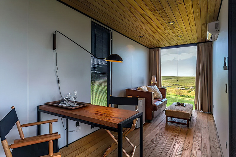 以12米長的集裝箱為主體結構,50平方米的一居室預制集裝箱房,有一個完全朝東的玻璃金屬盒子,享有日出的特權。