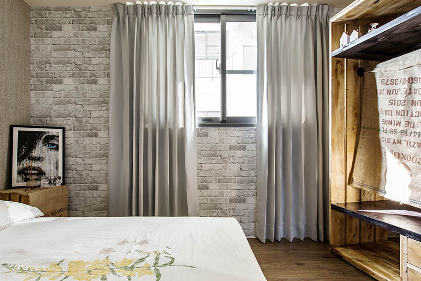 客房收納空間大,跟主臥室有著相同特點,并以棧板回收再利用組成儲物區域。另外,為修飾明顯梁柱,設計師運用灰磚壁紙達到轉移視覺效果。