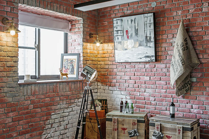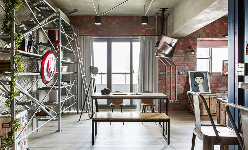 裸露紅磚墻不貼滿,帶有些微破壞力道,加上故意噴上的白色水泥漆,從客廳延伸至餐桌的墻面充滿工業風色彩,展露自由不羈生活態度并呼應不修飾壁面;電視采用機動性擺放,外觀符合空間設定,朋友來訪時也能隨時移動,方便每個角落都看到畫面。除了詮釋工業風精神,設計師在此案中多應用可再利用材質,像是木棧板沙發、回收木箱,融合場域風格也賦予對象新生命,家具能輕易移動位置,更方便喜愛攝影的屋主捕捉畫面。