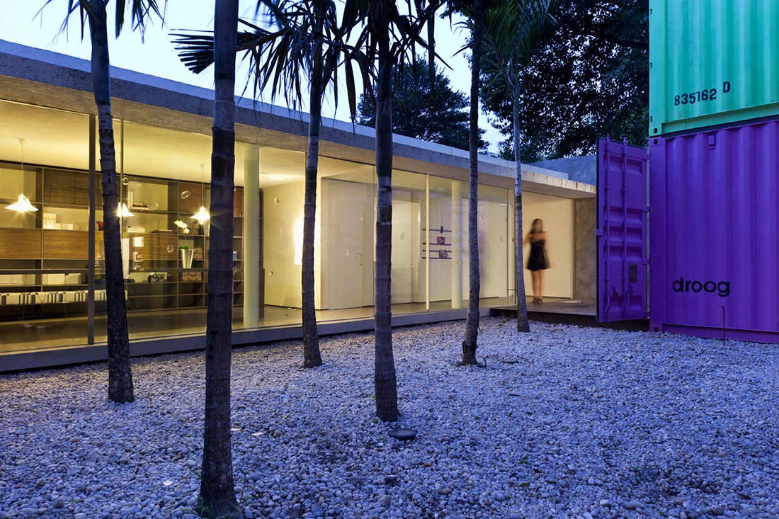 當時的想法是用二手的集裝箱,重新組成一個現成的對象。該項目利用集裝箱組織了兩條通道,同時其內部空間發揮線性的優勢,和一個雙層高度的體量依附于它,對比立方體體積。巨大的聚碳酸酯推拉門連接商店與城市的一個內花園。