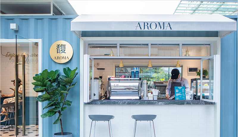 干凈簡潔的室內風格加上占據集裝箱整個側面的透亮玻璃窗,顯得 Aroma 的小空間一點不擁擠,反而還多了些溫馨。