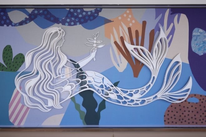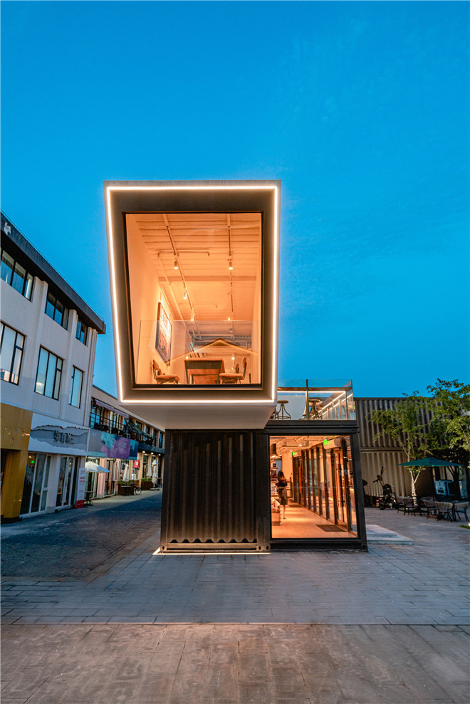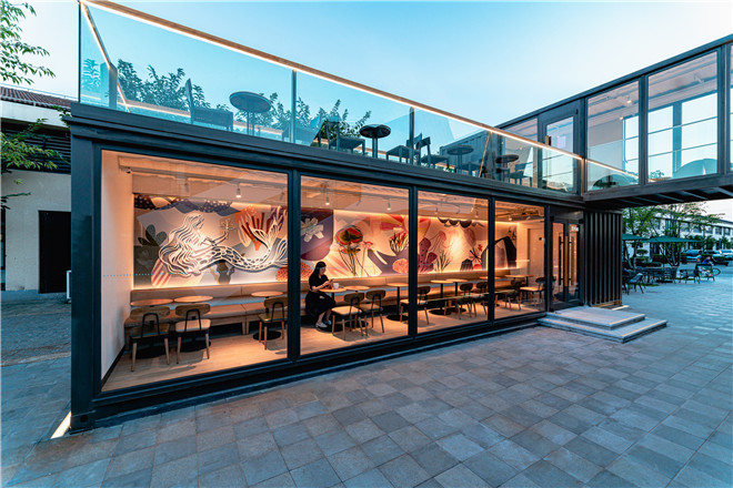 集裝箱空間都具有強(qiáng)烈的工業(yè)風(fēng)和極簡風(fēng),所在的智慧灣科創(chuàng)園也是一個(gè)以集裝箱為主題的個(gè)性化定制園區(qū),園內(nèi)還有中國3D打印文化博物館,可以體驗(yàn)3D打印技術(shù)互動(dòng)。一層獨(dú)立箱體的用餐區(qū)墻上,就有一幅3D打印的巨幅星巴克美人魚作品。