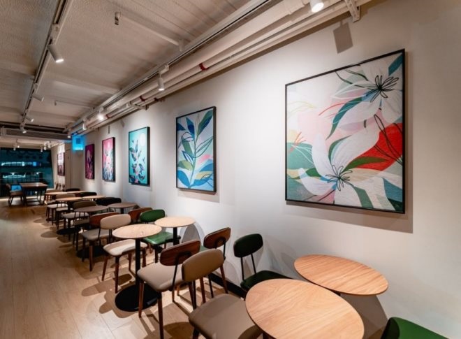 而二層純白色的空間內(nèi)掛著各種現(xiàn)代風(fēng)格的咖啡主題藝術(shù)畫作,描述著咖啡豆種植的場景,其中毛氈編織的藝術(shù)品更是再現(xiàn)了星巴克西雅圖首家門店的歷史感。未來還將有更多藝術(shù)品在二層空間展出,組成咖啡店里的“微型藝術(shù)展”。